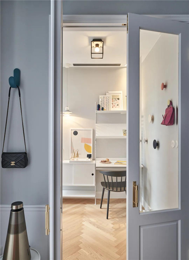 沙发墙后的玻璃门后,是书房区域,玻璃门让空间独立的同时,视觉更加通透,让采光得以共享。